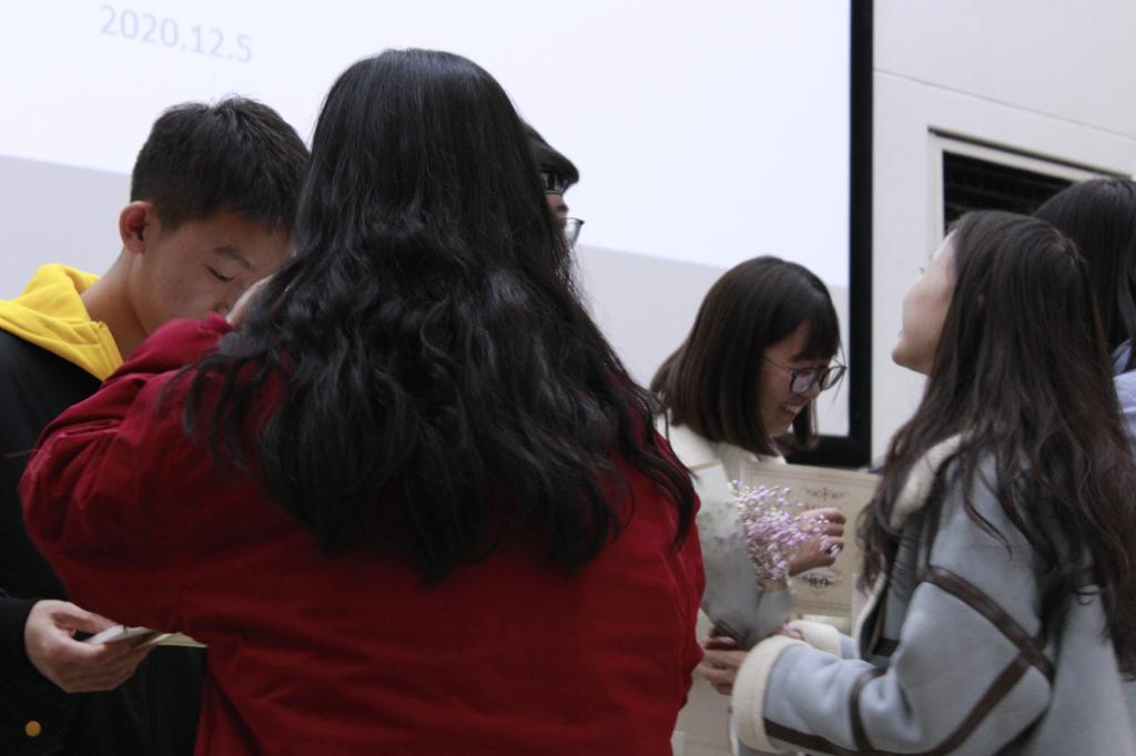 接下来,学生班主任聘书发放仪式开始,来自2020级四个专业(类)的13名学生班主任助理上台接下了属于自己的聘书。随后,各班团支书上台给学班们送上自己精心准备的礼物。对此,广告2002班学班杨婉新表示:“真心觉得自己能够成为学班十分幸运,很幸运遇到2020级可爱的老师同学,也很感谢艾老师和所有2020级小朋友给我带来的惊喜和温暖!”关于聘书上的时间,法学2001班学班王承尧提到:“聘书上的聘用时间是2020年9月至2021年8月,我更想让这个结束时间变成2022年6月,只要我还在华农,就希望能有更多时间和法学2001班的同学们在一起。”学班们协助班主任老师的工作,为新生更好地开启他们的大学生活提供了莫大的帮助。颁发完毕,台下的同学们致以他们最热烈的掌声,掌声中所包含的是最诚挚的谢意。