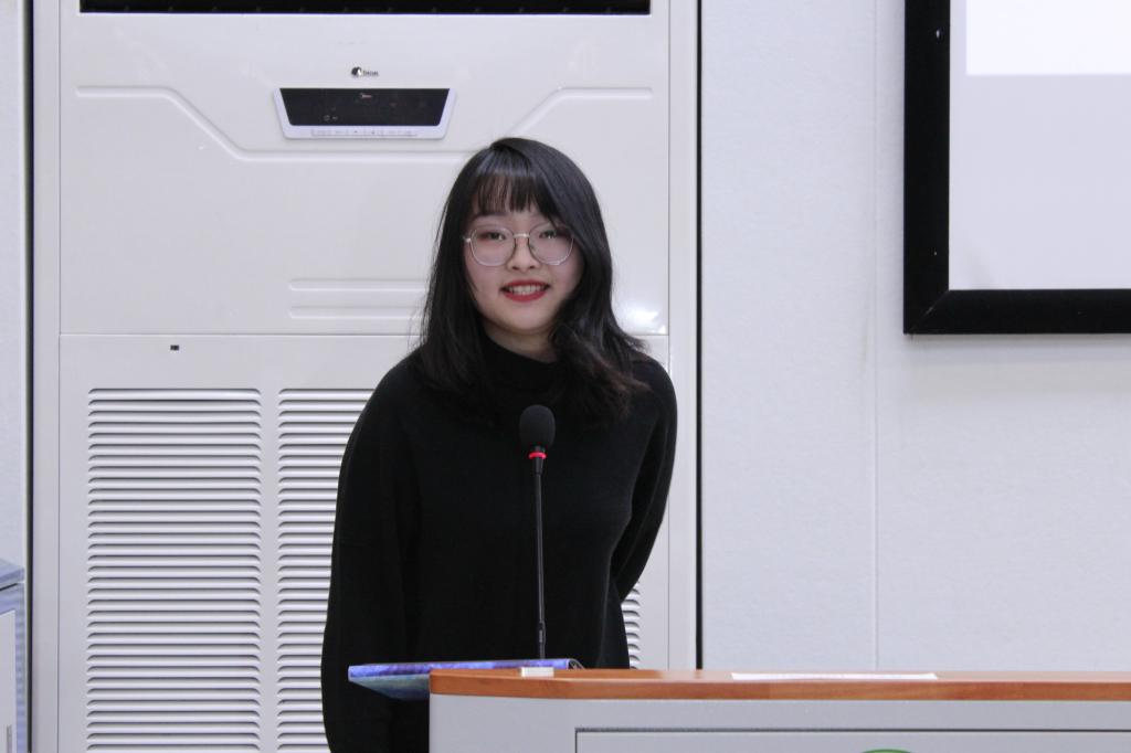 随后,大学生标兵蒋楷郁上台进行了分享。她认为同学们首先需要学会规划,“规划不仅要看起来漂亮,更要做起来漂亮。”至于如何 “做起来漂亮”,她提了自己的一些建议:用效率代替时间,而不只是看起来那么“繁忙”;试想事情的结果,用“倒逼”的方式保证执行力;根据自己的性格、时间、目标等因素选取适合自己的学习方式。对于如何面对日常学习和生活中的焦虑,蒋楷郁认为:“先勇于面对现实,一一找出焦虑产生的原因,再敢于接受不利,一一解决焦虑的原因,学会取舍”。接下来,她分享了自己有关努力的看法:“努力不一定会成功,但不努力一定会后悔。比失败更失败的感觉是后悔。”最后,她以“每个人都可以成为第一,为什么不是你”作为结束语,鼓舞在座的2020级同学们不断努力,奋发向上。