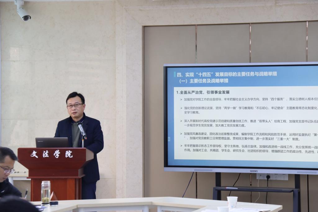 院党委书记瞿明勇全面总结了学院“十三五”规划完成情况,并对“十四五”规划进行了汇报。他谈到,要全面从严治党,引领事业发展;聚焦质量提升,全面实施一流本科人才培育行动计划实施方案,深化学位与研究生教育改革,培育一流人才;强化内涵建设,争创一流学科;坚持引育并重,建一流师资队伍;注重提质增效,围绕国家重大战略需求,促进一流科研;强化深度合作,提升国际化水平;加强文化建设,塑造文化品牌;深化改革,提高学院办学治院现代化水平。