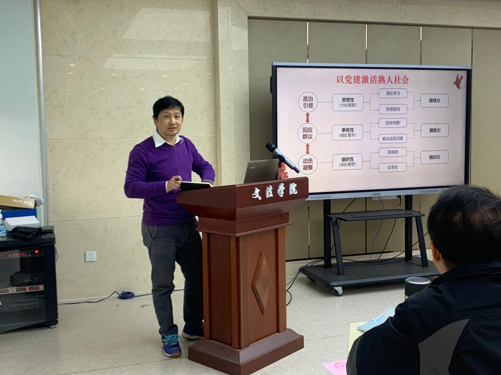 行政教工党支部书记孙站成介绍了支部坚持“党建+服务”融合发展理念,以建党100周年暨党史学习教育为主线,以“我为师生办实事”为落脚点,用实际行动助推学院核心工作有序进行。