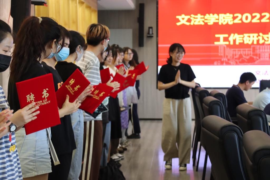 会上,学院党委书记瞿明勇向2022级新聘班主任颁发了聘书,2022级辅导员刘一丽向学生班主任助理及下班党员颁发聘书并通报了迎新工作准备情况及新生入学教育相关安排。