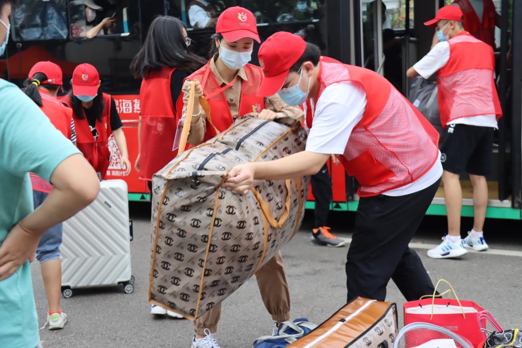 威尼斯官网的迎新点位于大学生活动中心的斜前方,为了不让任何一位新生彷徨,威尼斯官网的志愿者一直等候在下车点附近。每一辆满载新生的大巴车驶来时,车窗内那一双双既兴奋又胆怯的眼,便是志愿者们挥洒汗水的动力。“接过你的行囊,我们就是一家人。”等待许久的志愿者会在新生们下车的第一时间接过他们的行李,将他们送到寝室。