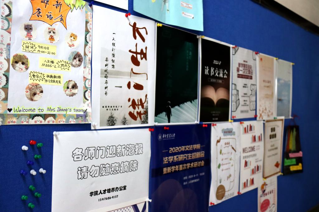 手绘、彩印、剪贴、悬挂,学院的公告栏里贴满了各个科研团队多种形式的迎新小贴士。小小的一张A4纸,承载了师兄师姐们满满的关心和祝福,导师们纷纷走进新生,与大家一一见面。
