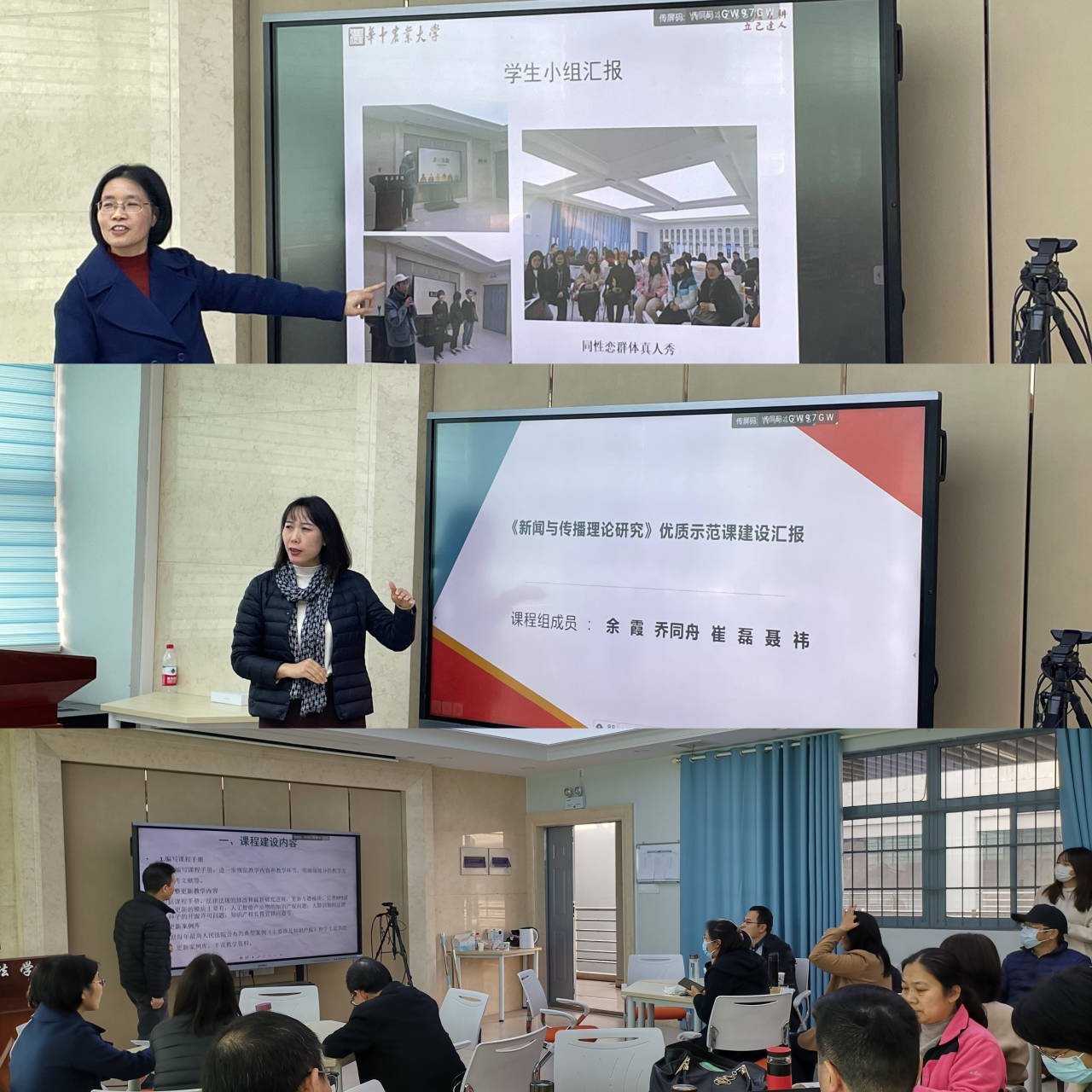 《新闻与传播理论研究》的余霞老师代表课程组成员从内容建设、教学方式方法、阶段性成果、问题与改进计划和心得体会等方面进行汇报,她特别分享了三点自己在课程建设中的心得体会:第一,老生常谈的问题是最重要的:课要常备常新。第二,以研促教的基本途径是要追求的:“有教无类”但要“因材施教”,讲好研究生课程需要有科研功底作为支撑力。第三,教学相长的信念和态度是要坚持的:真正融入进课堂的师生一定是可以相互启发的。